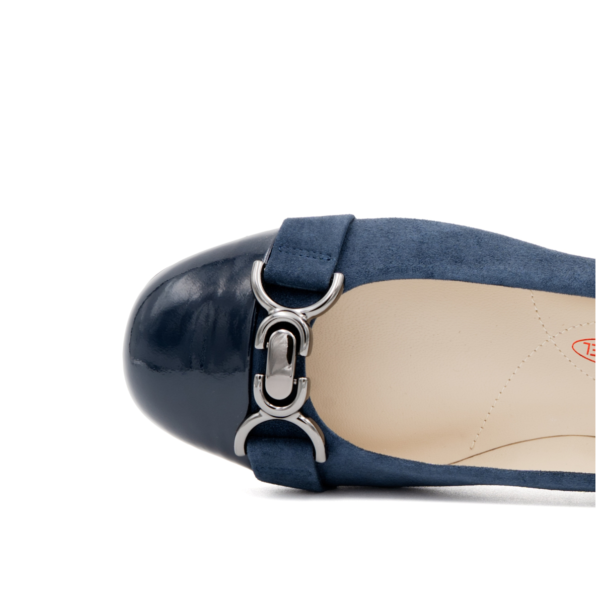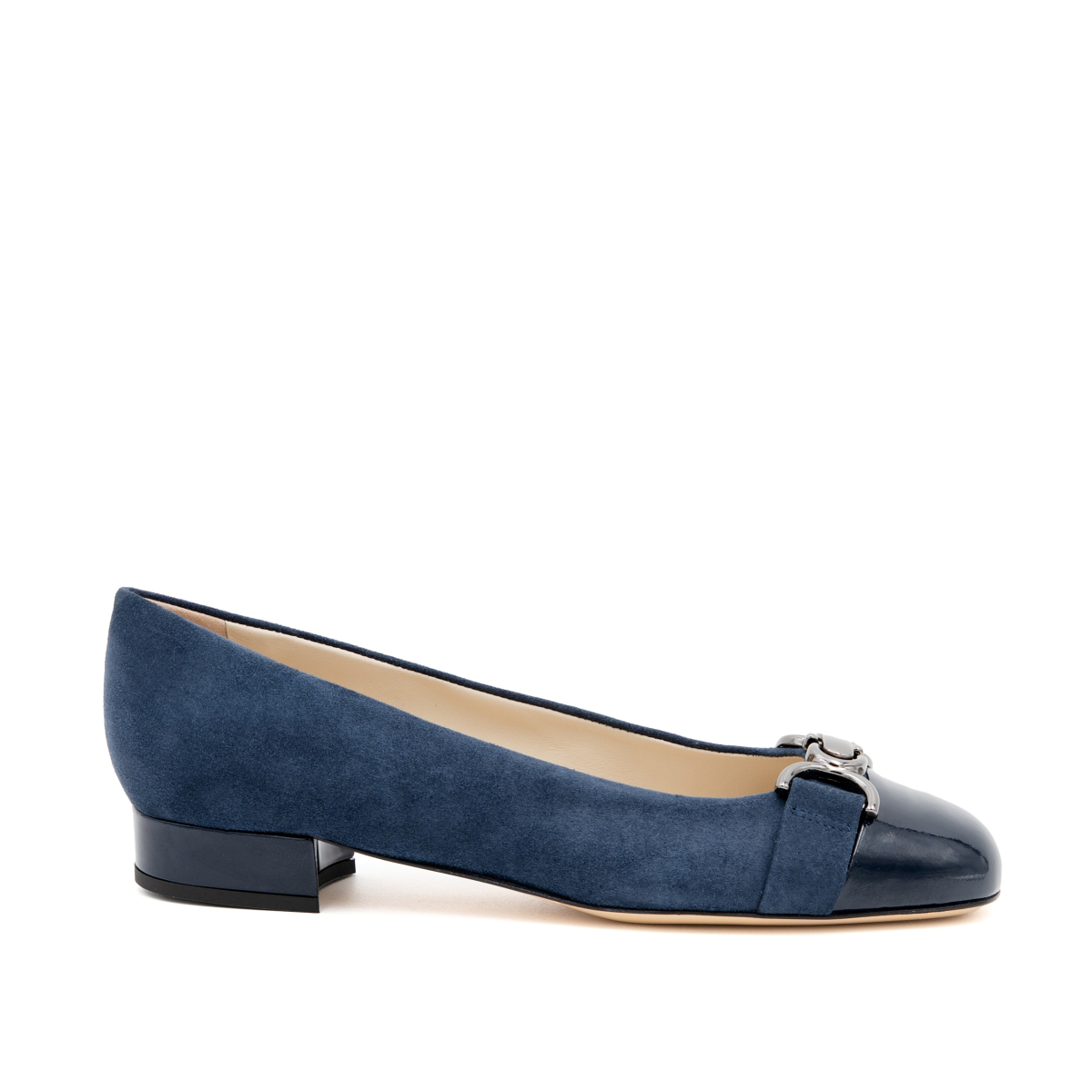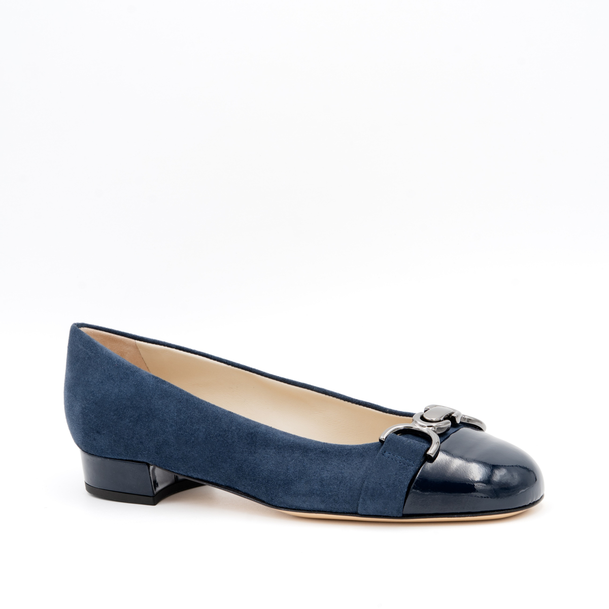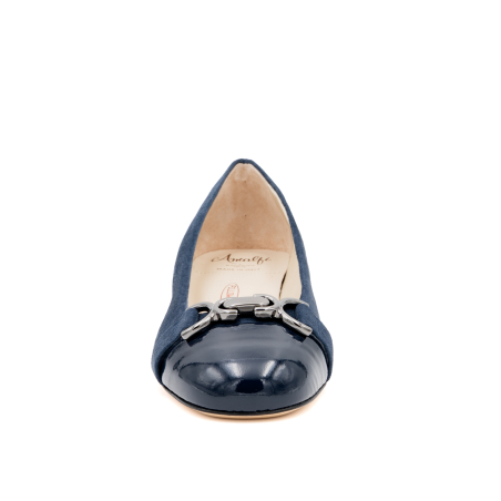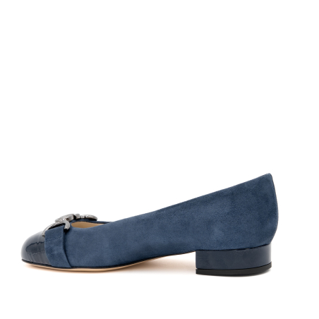 Surely the most iconic shoes of the new winter season: ballerinas. Our Miele ballerinas are the perfect accessory to make any outfit chic and elegant without compromise. Inspired by the classic 50s shoes, they give a timeless elegance. Here in a version with an two tone suede and patent with a matching metallic accessory on the tip. Wear with jeans or under a classic little black dress.