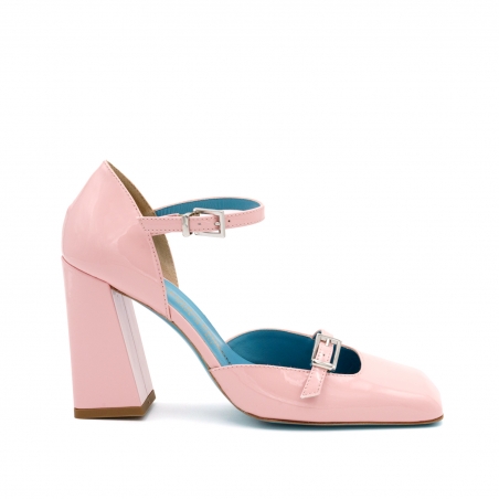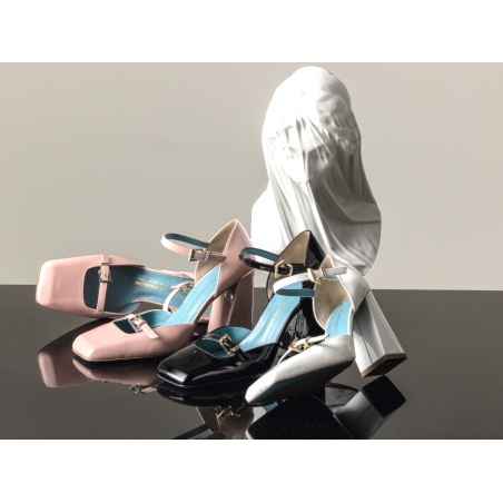 Our Zete pumps are the must-have of this season: classic but modern, elegant but also fun thanks to the new block heel slightly flared on the bottom that gives stability but also a feminine silhouette, very trendy this season. A shoe with character with double lace at the ankle also at the tip, but extremely versatile, in patent leather version to be ready for any occasion, work or leisure.