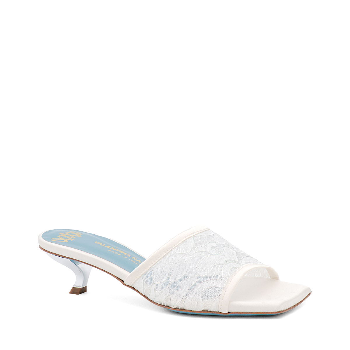 Elegant mule sandal in soft lace fabric with shiny details Italian with our new trendy metallic "comma" kitten heel for a modern and comfortable look. The heel gives stability and is perfect for many occasions, even stronger comfort also from the memory foam insole for extreme comfort. Leather sole with non-slip rubber insert. Ideal for a dinner, an aperitif or for any daily occasion. Handcrafted and top quality product.