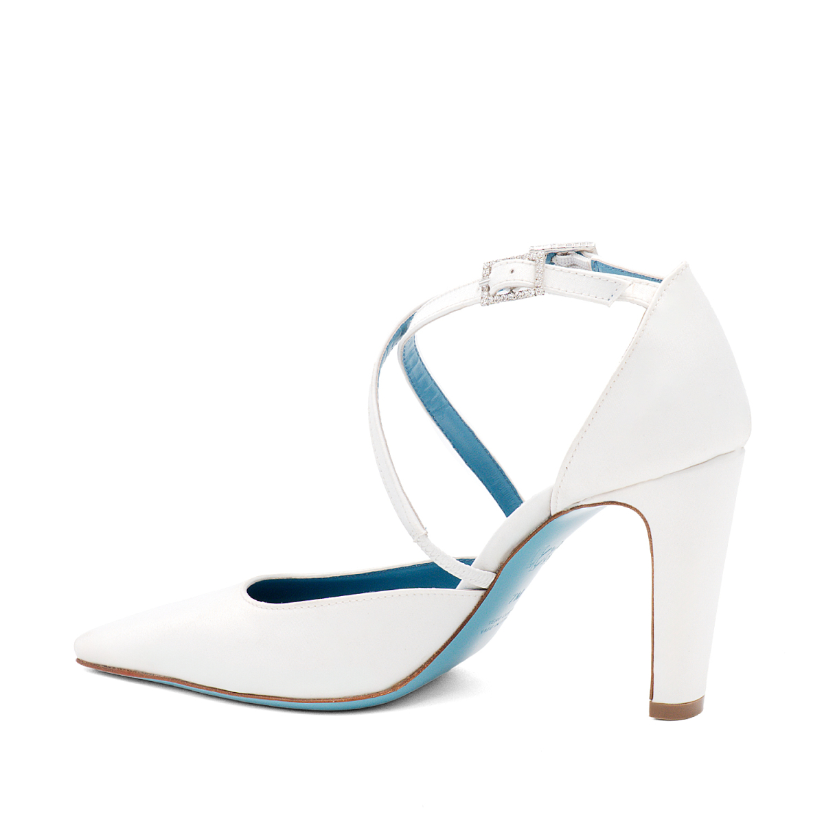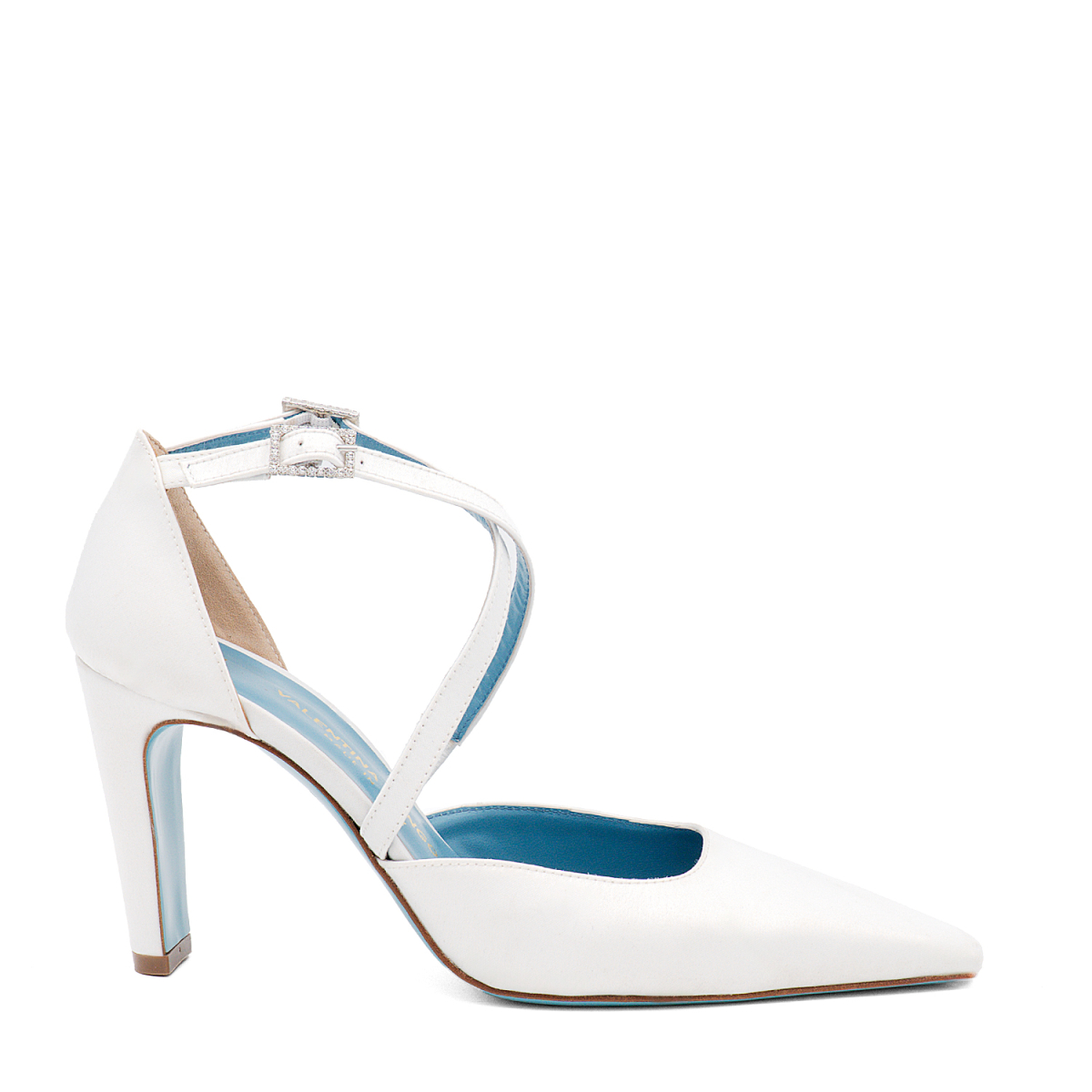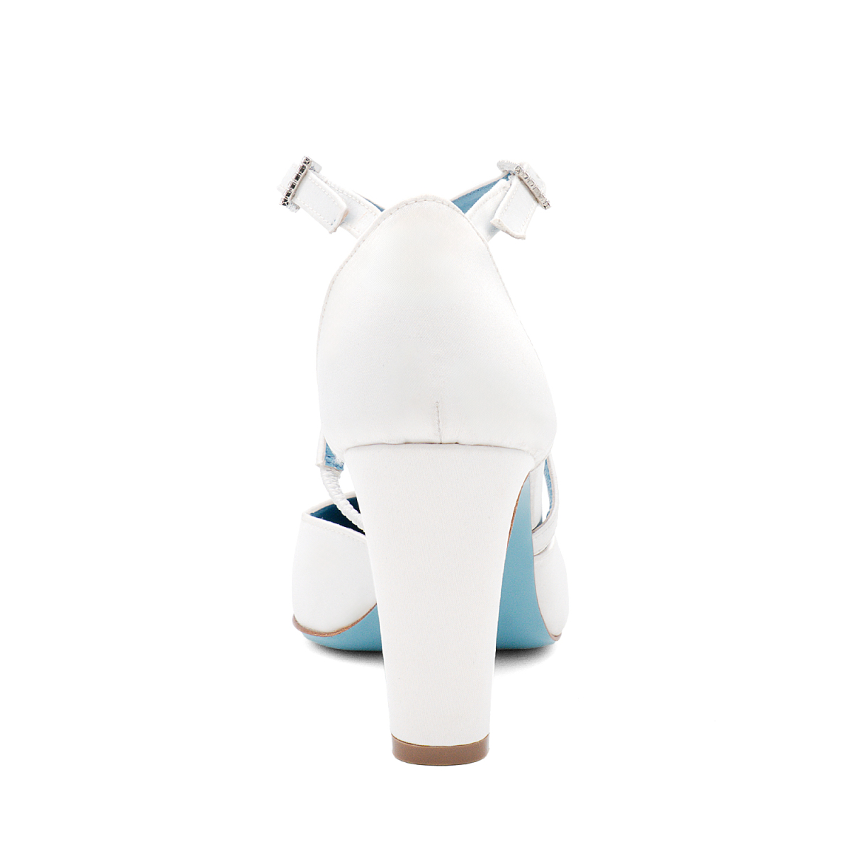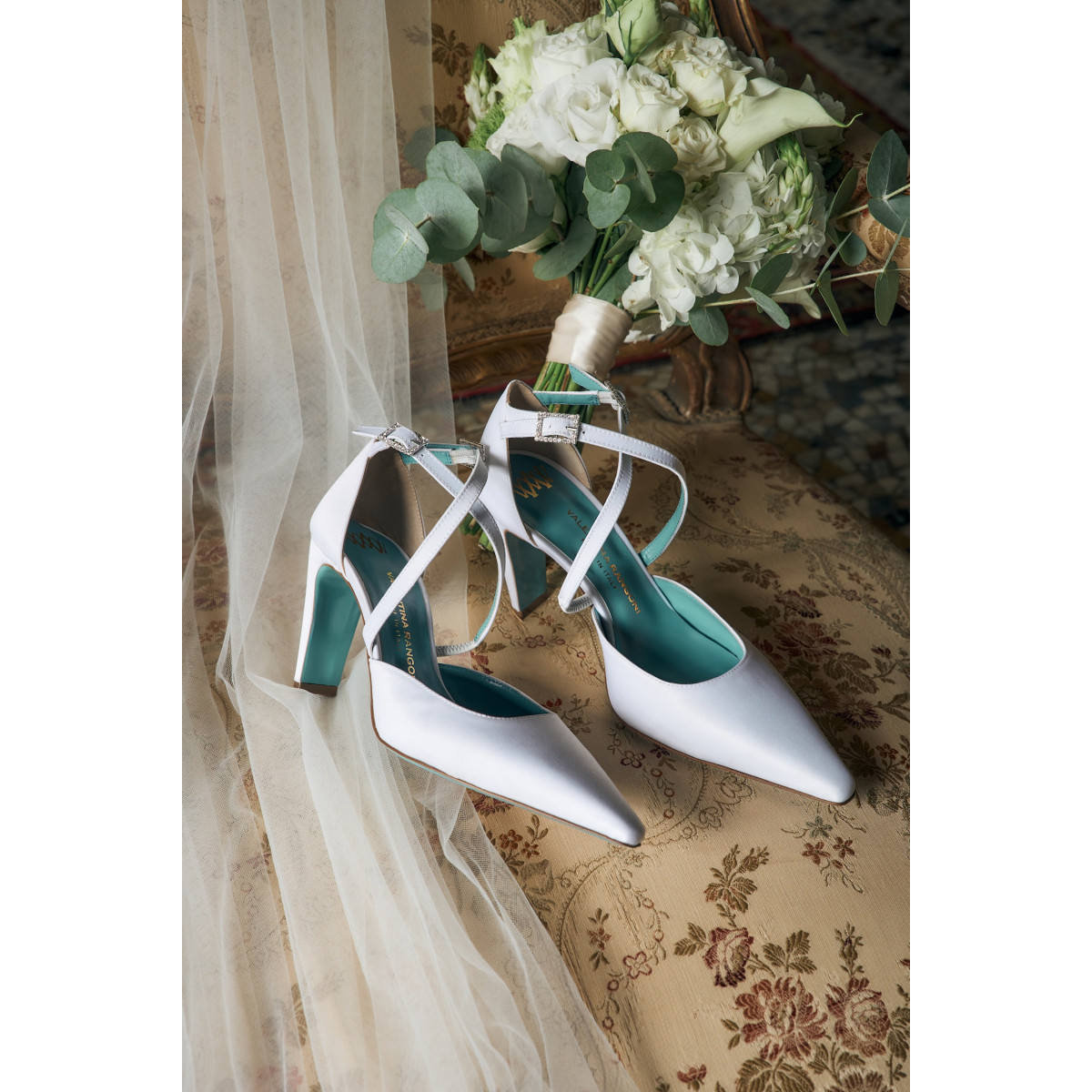 Our FELICITY satin bridal pumps are the shoes you've been waiting for on your wedding day: classic yet modern, elegant yet playful thanks to our iconic square heel that provides stability and height. A distinctive yet extremely versatile shoe, featuring this braided detail on the front and the rhinestone-covered double buckles.