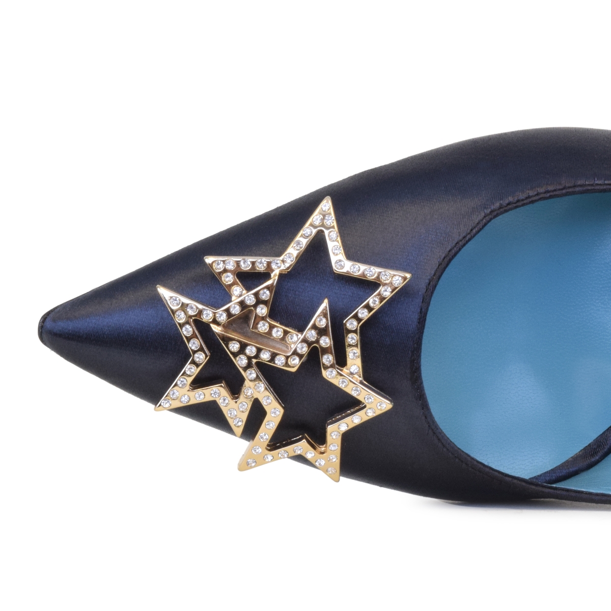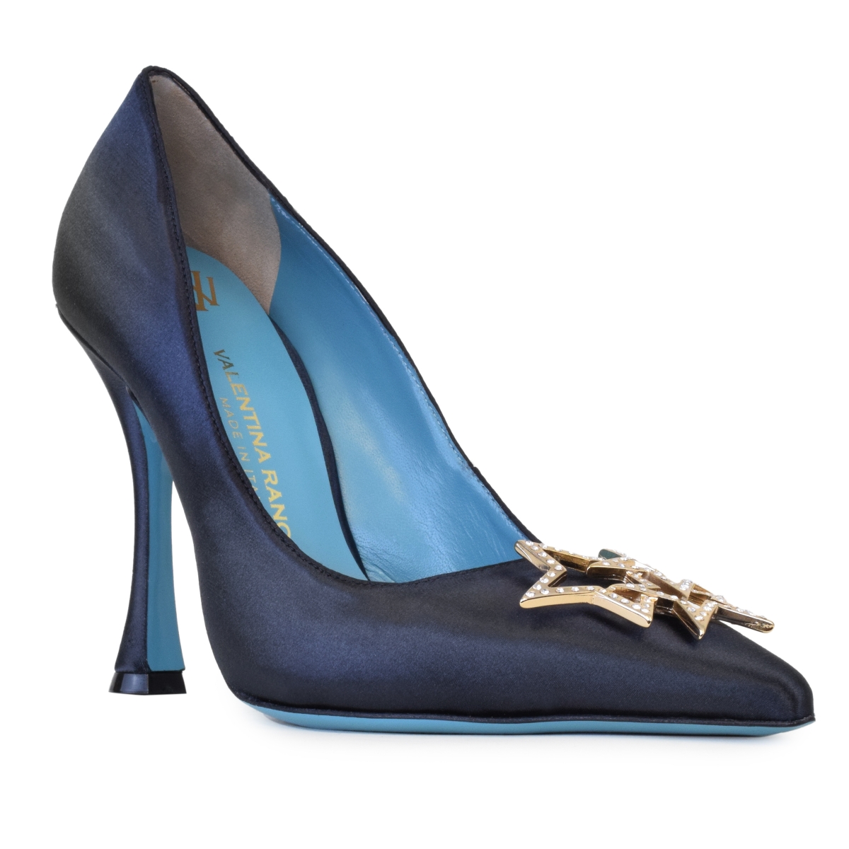 La nuova decollété Valentina Rangoni: brillante, dal design pulito ed estremamente sensuale, divertente nella versione in un raso di grande qualità e decorate in punta da un accessorio composto da tre stelle ricoperte di cristalli. Senza mai perdere l'inconfondibile comodità che contraddistingue tute le nostre scarpe.