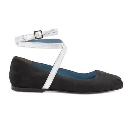 Sicuramente le scarpe più iconiche della nuova stagione invernale: le ballerine. Le nostre Ballerine Birba sono l'accessorio perfetto per rendere qualsiasi outfit chic ed elegante senza compromessi. Ispirate alle classiche scarpe del mondo della danza ma con un dettaglio in più per farsi notare: un doppio laccio in pelle metallica intorno alla caviglia. Le ballerine artigianali Birba donano un eleganza senza tempo. Qui in versione black con dettaglio argentato. Da indossare con jeans o sotto un classico little black dress.