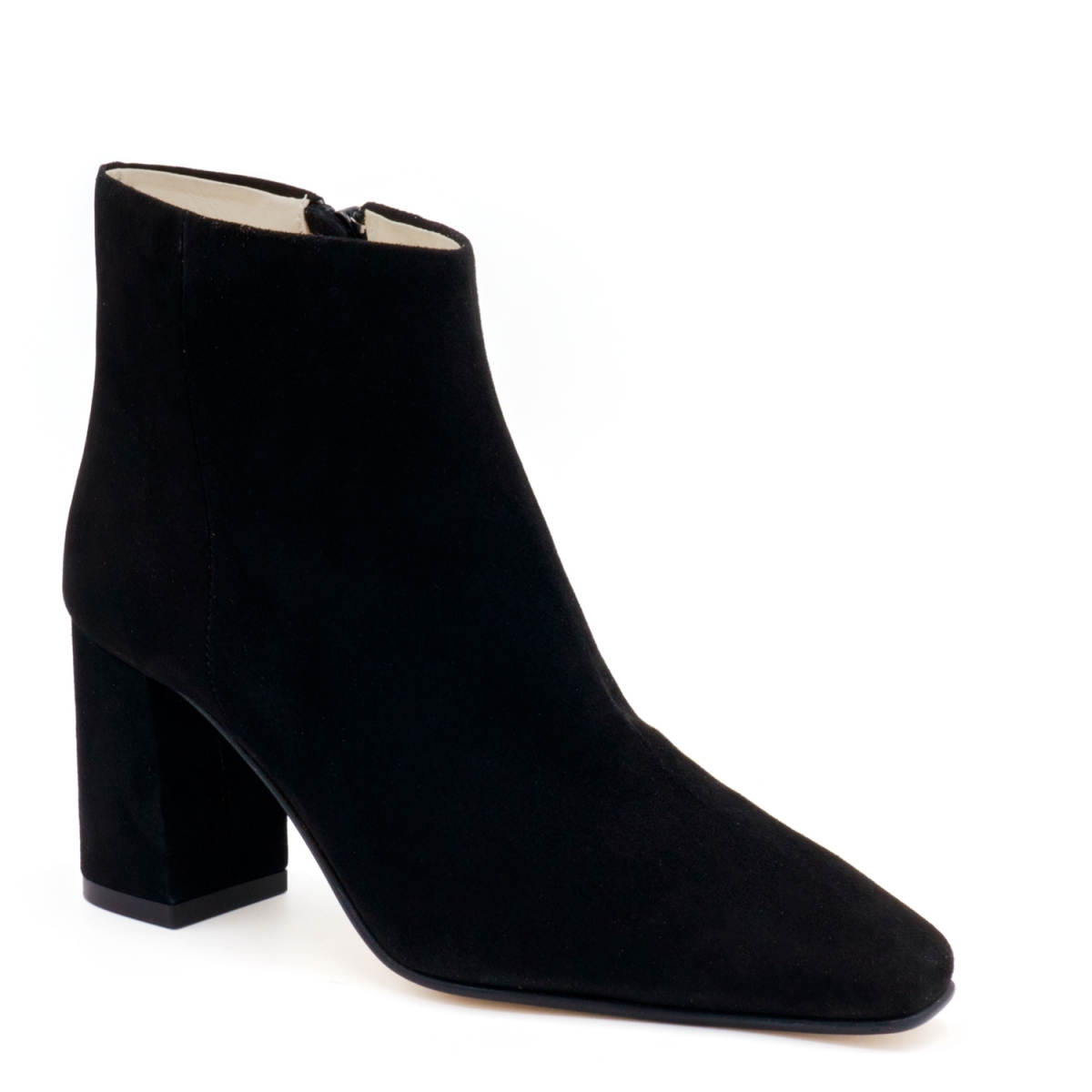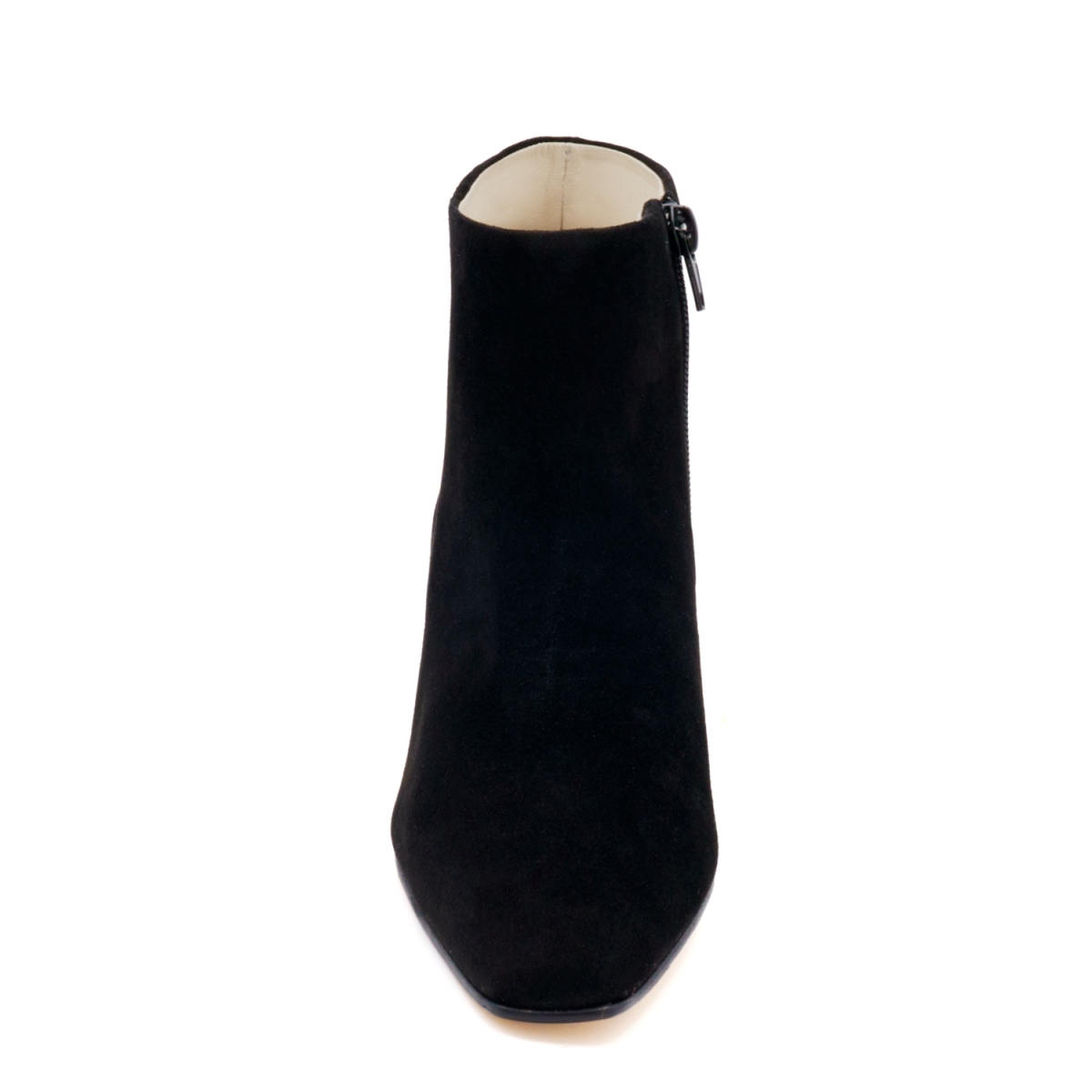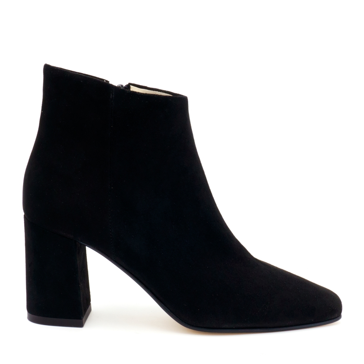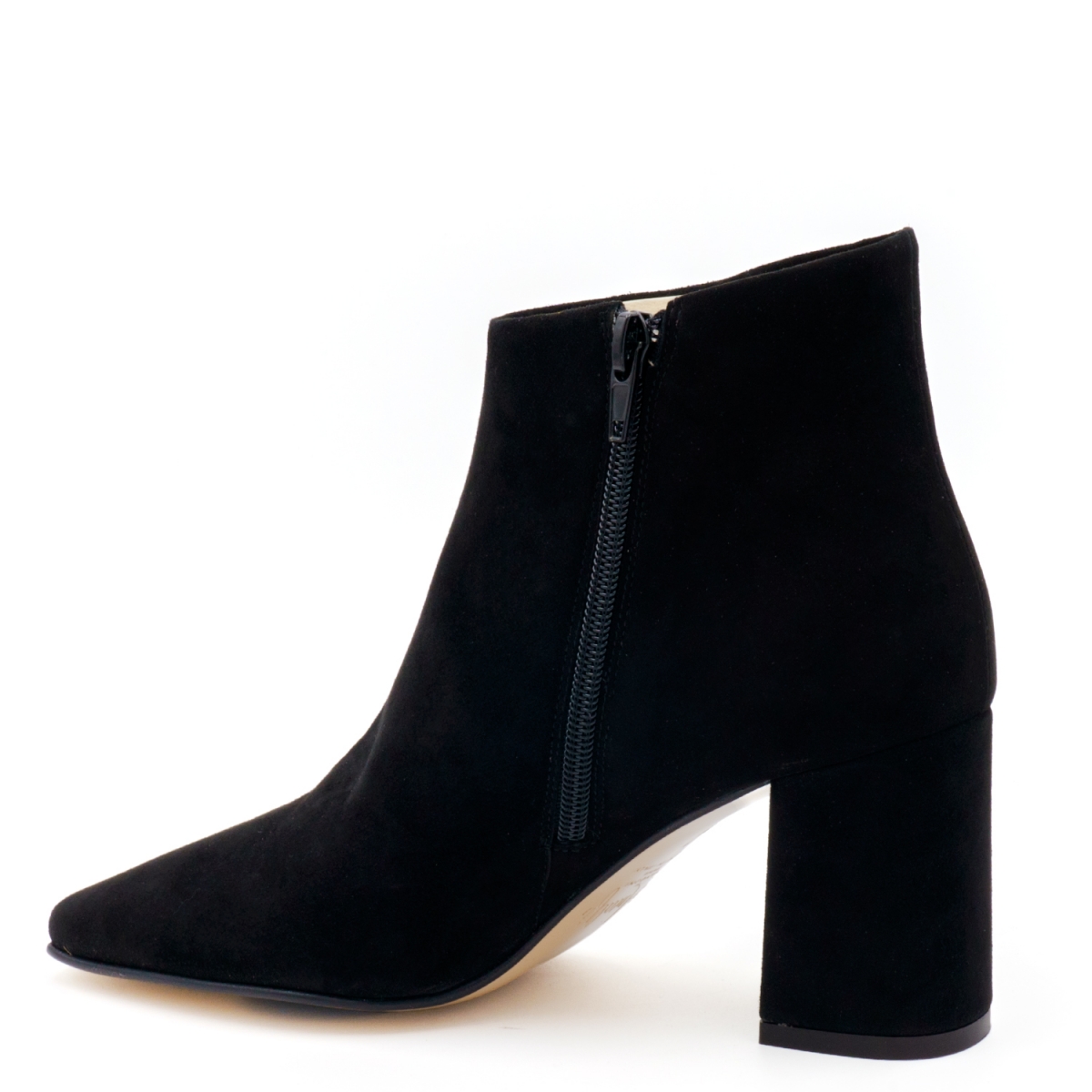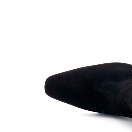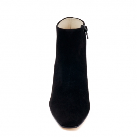 Stivaletto in camoscio con punta lunga e squadrata e tacco squadrato medio.alto. Suola in cuoio con inserto in gomma antiscivolo. Il taglio affusolato e creano una silhouette femminile e versatile, rendendo questa scarpa adatta a tutte le occasioni.