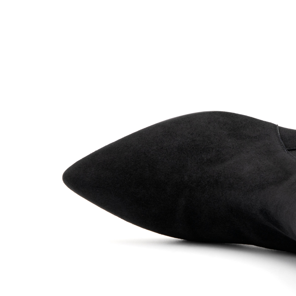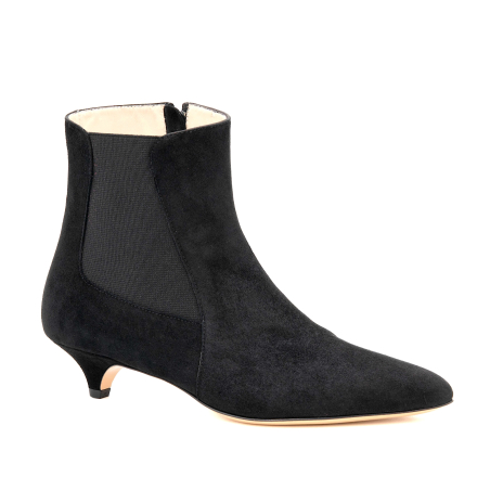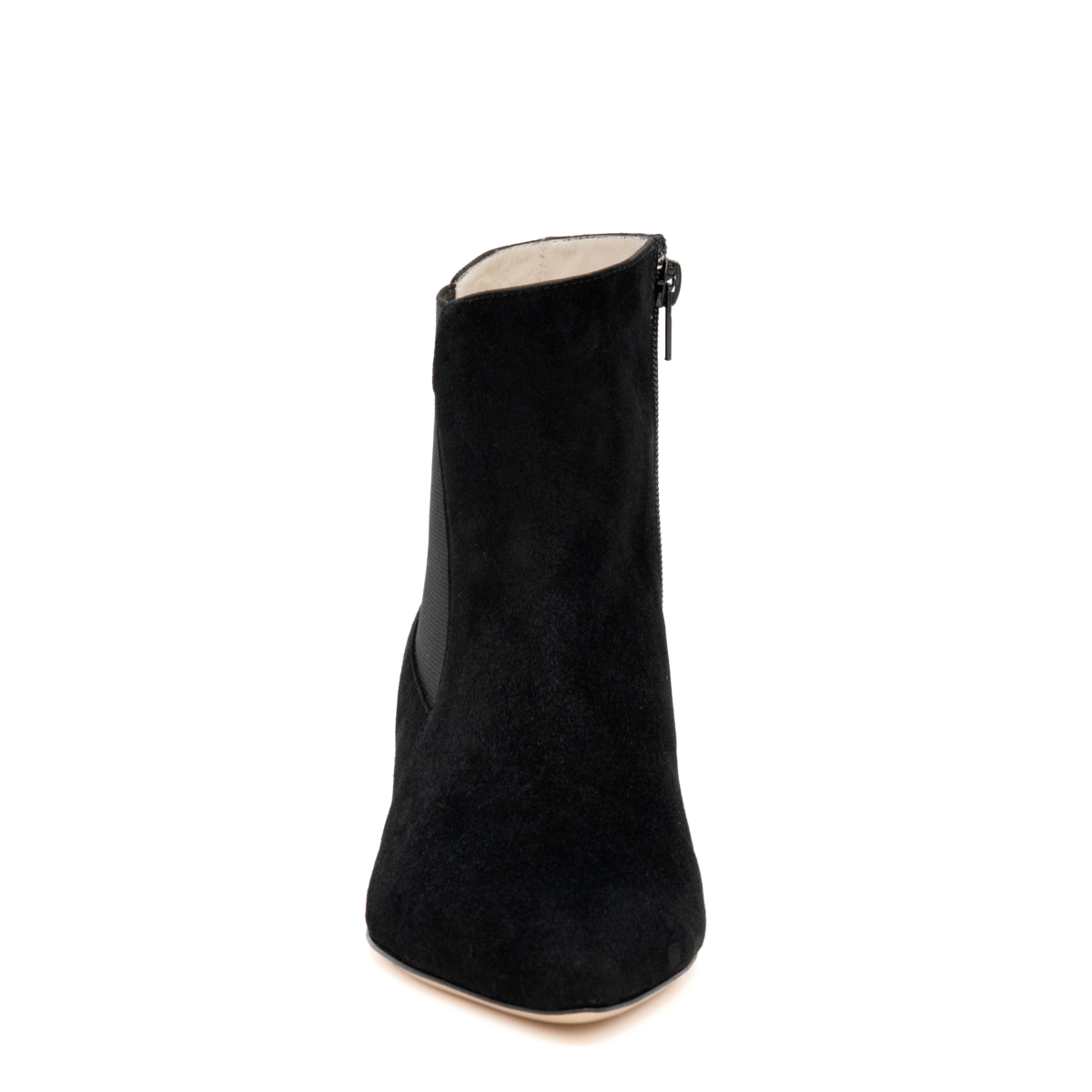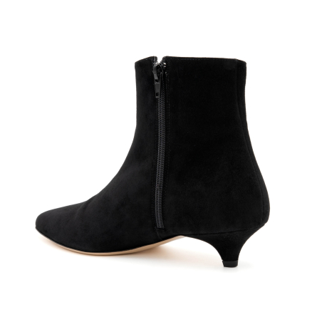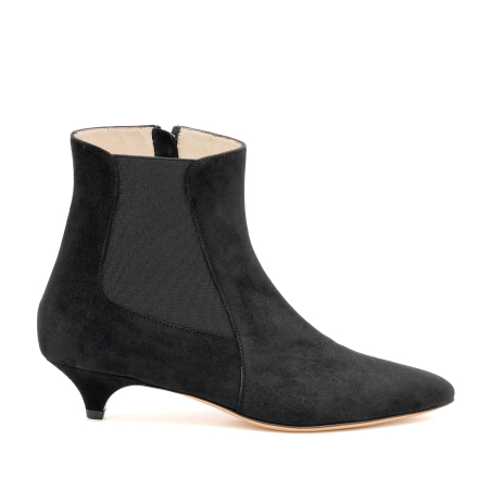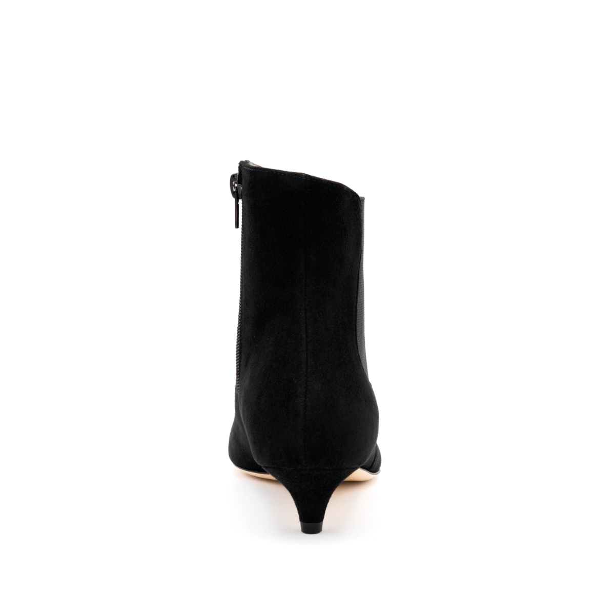 Stivaletto in pelle scamosciata con punta affusolata e tacco kitten. Caratterizzato da due elastici ai lati della tomaia che garantiscono un comfort e morbidezza senza uguali. Suola in cuoio con inserto in gomma antiscivolo. Il design casual ma di alta qualità e i materiali rendono questa scarpa adatta a tutte le occasioni.