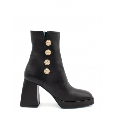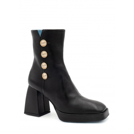 Il nostro stivaletto squadrato iconico con un originalissimo tacco in pelle di nappa ispirato al look anni 90, decorato con questi nuovi bottoni metallici Valentina Rangoni sul lato. La forma di questo stivaletto alla caviglia in pelle con punta e tacco squadrati rende qualsiasi outfit audace e moderno. Questi stivaletti audaci alla caviglia sono un must di stagione, per una vera "it girl", perfetti con jeans skinny e un abito più romantico.